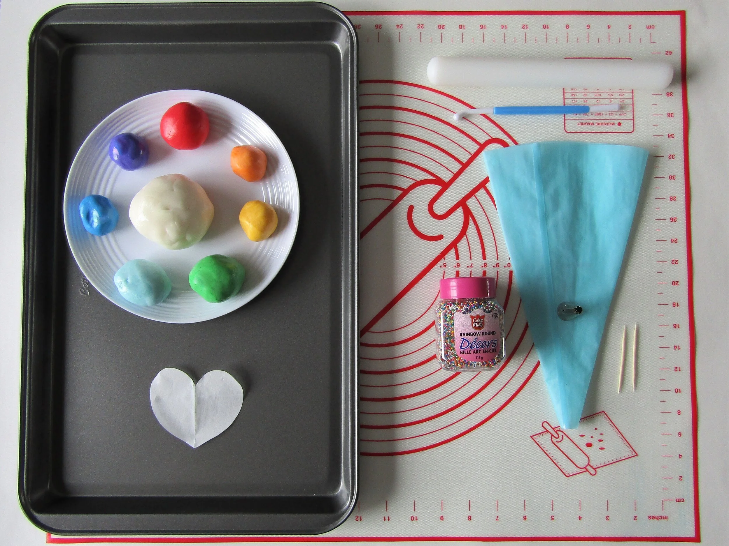 Étendez les petites billes arc-en-ciel dans la plaque à biscuits. Vous aurez besoin d’environ la moitié du pot. Collez le cœur de papier parchemin sur le gâteau. Ensuite, roulez le gâteau sur les petites billes de façon à le recouvrir uniformément sur les côtés et le dessus.