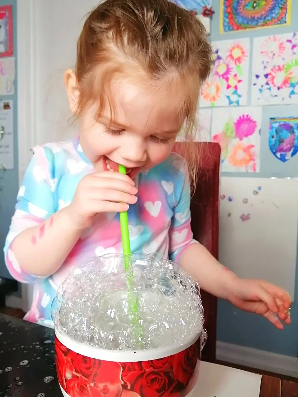 4. Ensuite, il suffit de faire une première bulle, de retirer la paille, de l'insérer de nouveau dans la bulle et d'en créer une nouvelle à l'intérieur de la première.